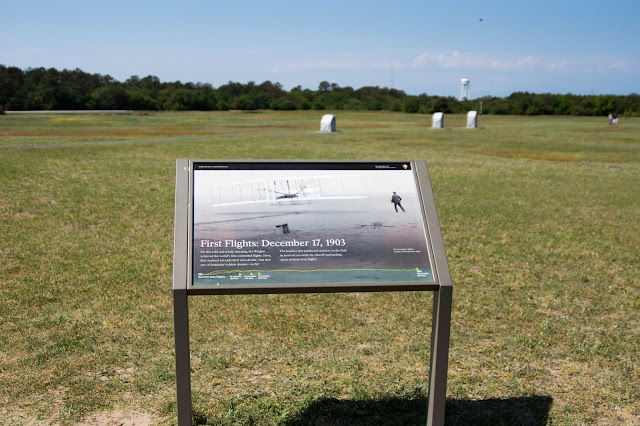 The Wright Brothers National Memorial covered a large outdoor park area, with a monument on top of a hill, and the take-off spot of the first four flights at the bottom and a ways a way from the hill that the monument was on top of. Eric and I assumed that the top of the hill was where the actual first flights happened, but no, the first flights took off from level ground at the bottom of and a ways a way from that hill where the monument was, which was conveniently next to the parking lot we parked at, but like a gazillion miles away from the top of the hill that we had hiked to the top of in 90° temps thinking that if we were going to fly an airplane for the first time, that is where we would fly it from. Except that Eric and I don't know how to fly airplanes.... soooo... what the frick were we thinking.